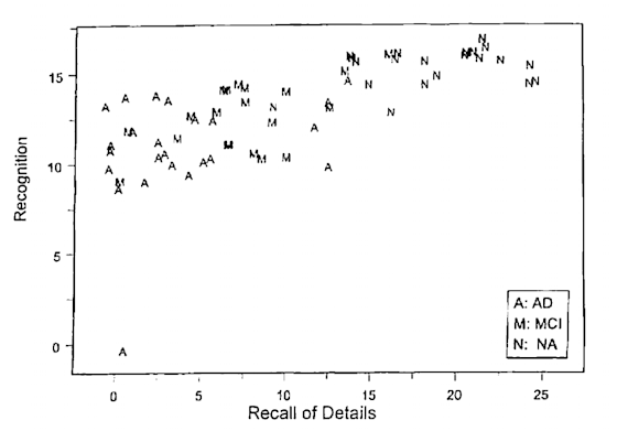 Figure 2 displays the differences in the discourse gist measures of recognition and recall of detail between individuals with Alzheimer's disease (A), mild cognitive impairment (M), or a control (N).