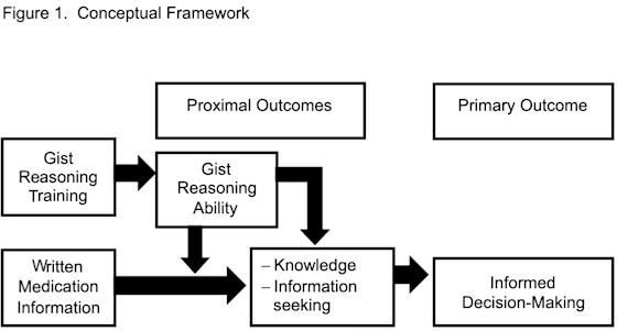 Figure 1 demonstrates the conceptual framework behind this study which concludes that providing gist reasoning training can make individuals better consumers of information. Which, in the context of medication information, leads to more informed decision making regarding treatments.