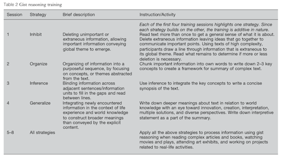 Table 2 displays the cognitive strategies that were addressed in each training session for the participants.