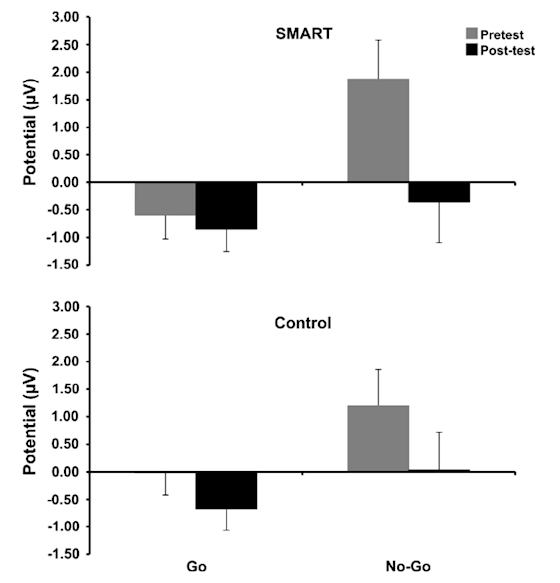 Figure 8 displays the differences in pre-and post-test results from both the controls and those who completed the SMART training. The suggested mechanism for increased inhibitory control in the SMART condition is a generalized engagement in deeper semantic processing.
