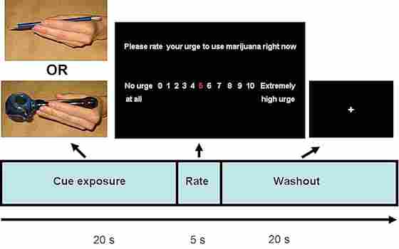 Figure 3 displays the experimental protocol used in this study. Participants were given random sequences of marijuana paraphernalia and neutral stimuli, then they rated their urge to use marijuana while inside an fMRI.