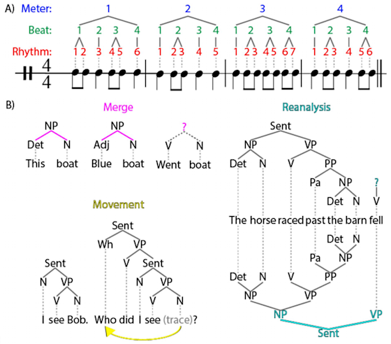 Figure 1 shows (A) an example of a music sequence, (B) examples of the syntax used repetitively in the paper with the three stages: merge, movement, and reanalysis.